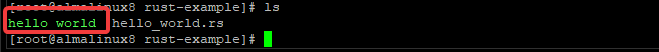 您可以运行 ls 命令列出当前目录中的所有文件。您应该在 rust-example 目录下看到一个名为 hello_world 的二进制文件。