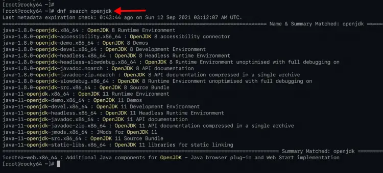 首先,您将更新 Rocky Linux 存储库并检查官方 Rocky Linux 存储库提供的 Java OpenJDK 的可用版本。