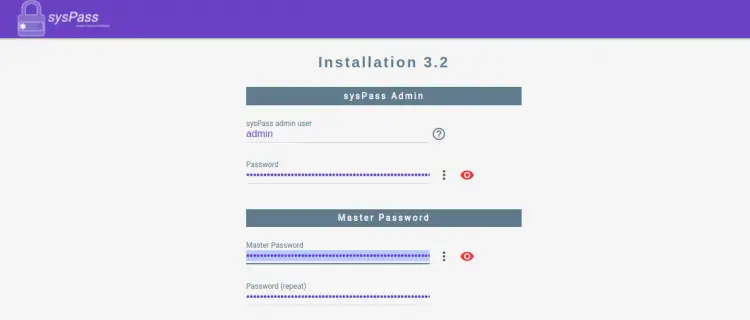 提供您的管理员用户名、密码、主密码、数据库凭据,选择您的语言、托管模式,然后单击“安装”按钮。安装完成后,您将被重定向到 sysPass 登录页面。