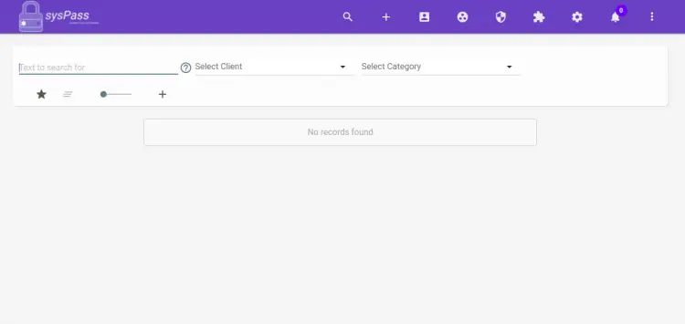 提供您的管理员用户名和密码,然后单击 > 按钮。您应该在以下页面上看到 sysPass 仪表板: