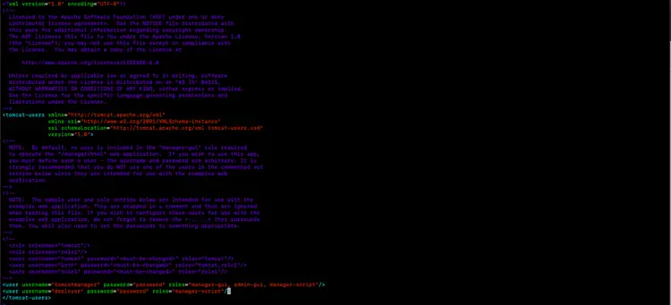 使用以下命令在 Apache Tomcat 中进行所需的配置。需要完成的配置请参考以下截图。在以下配置中,我们分配了一个用户和密码,可用于登录 Apache Tomcat 的管理器应用程序。记下此用户名和密码,因为稍后我们将需要这些凭据。
