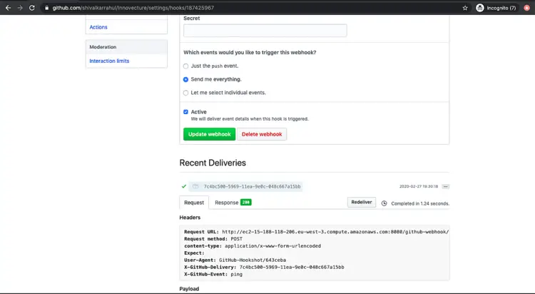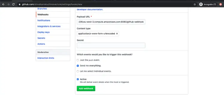 您可以选择要触发此 Webhook 的事件,或者如果您希望在每个事件上都触发 Jenkins 作业,则可以选择“向我发送所有内容”,单击更新 Webhook 以保存它。