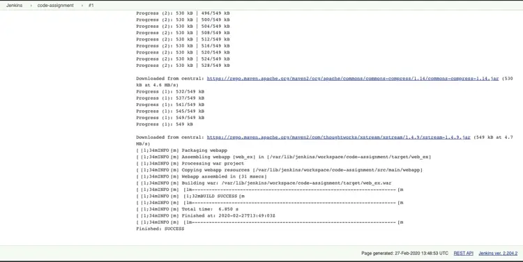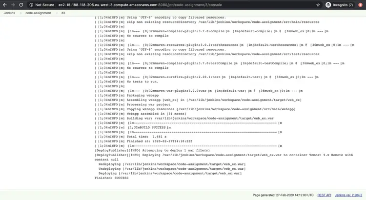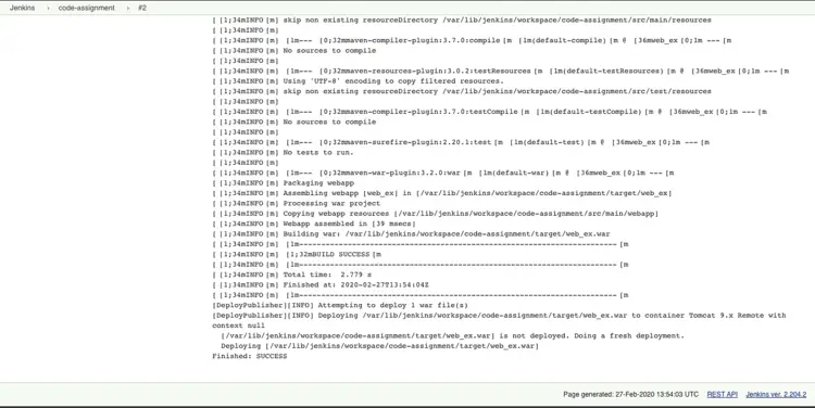 如果转到作业的控制台输出,您可以看到作业已成功执行并且 war 已部署到 Apache Tomcat。
