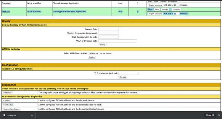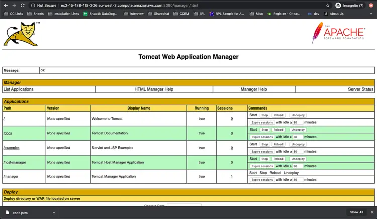 要测试 war 是否真的已部署,请点击 Apache Tomcat http://IP-of-Apache-Tomcat:8090/manager 以访问管理器应用程序。