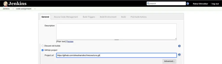 在常规选项卡下,选中“Github 项目”复选框并添加源代码仓库的 URL 或您从我的仓库中分叉的仓库的 URL。