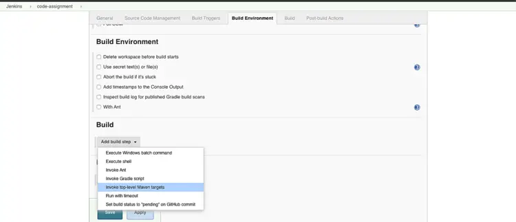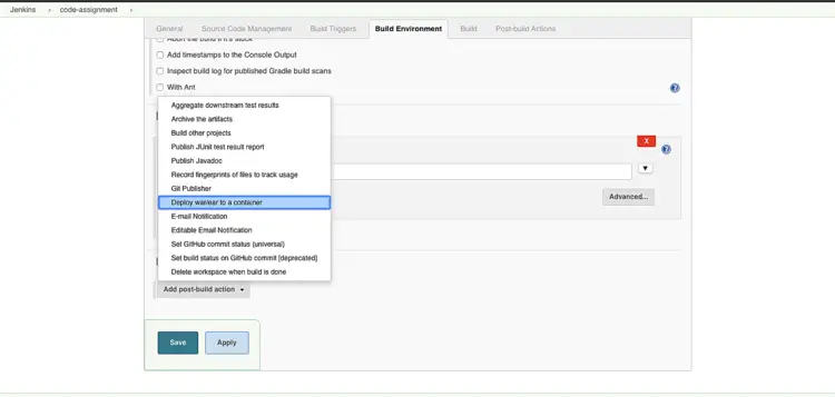 现在我们确定我们的代码正在被拉取和构建,现在我们准备添加一个构建后操作。要添加构建后操作,请单击构建环境下的构建后操作并选择“将战争部署到容器”。