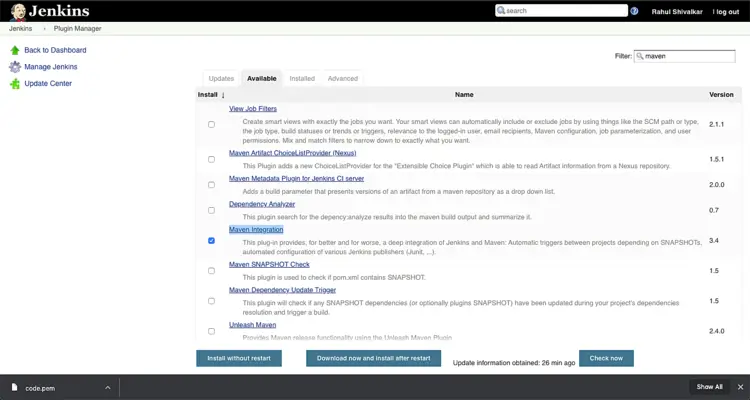 成功登录后,转到管理 Jenkins > 管理插件。 在 Available 选项卡下搜索 git。 选择“GithubAuthentication”插件并点击安装而不重启。