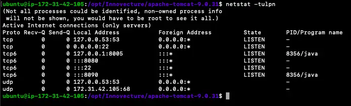 在下面的屏幕截图中,您可以看到 Apache Tomcat 服务正在端口 8090 上运行,而 Jenkins 服务正在端口 8080 上运行。要检查您的系统,请使用以下命令。