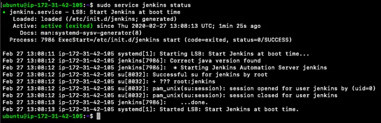 安装 Jenkins 后,使用以下命令启动它并检查其状态。