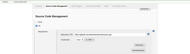 在源代码管理选项卡下,单击“Git”单选按钮并添加存储库 URL,如下所示。由于我的存储库不是私有的而是公开的,因此我不需要添加凭据。