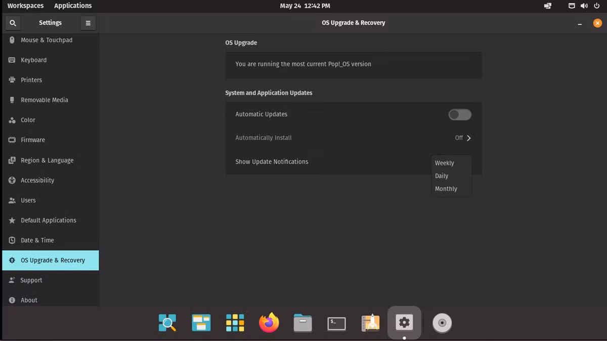 Pop!_OS 让您可以更精细地控制应用程序何时收到更新。您甚至可以为系统设置特定的日期和时间来更新 DEB、Flatpak 和 Nix 软件包。默认情况下,应用程序更新通知每周发送一次,但您可以更改此频率或启用自动更新。