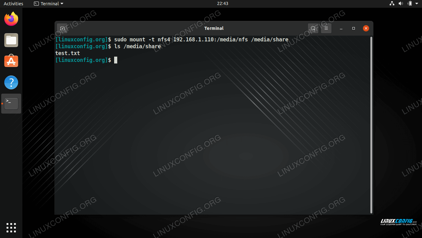 安装该软件包后,您将能够挂载 NFS 共享。因此,要尝试一下,请选择一个要挂载的目录,然后以 root 权限运行