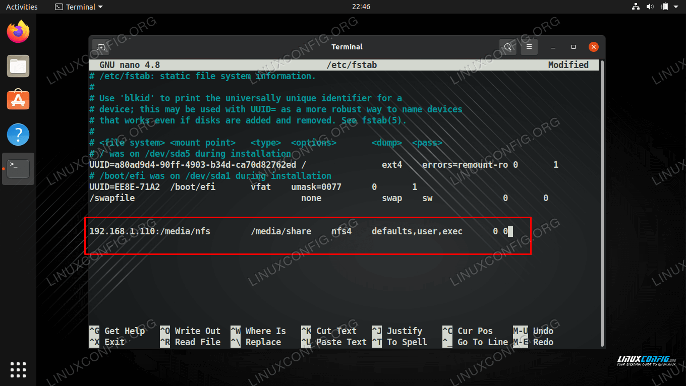 文件中。整体语法看起来很像您刚刚用来挂载共享的命令。从网络上共享的位置开始。接下来是要安装共享的位置。这里的文件系统类型是nfs4。这些选项由您决定,但对于非敏感共享,使用默认值并允许用户访问是很常见的。最终结果应该类似于下面的示例。192.168.1.110:/media/nfs /media/share nfs4 defaults,user,exec 0 0