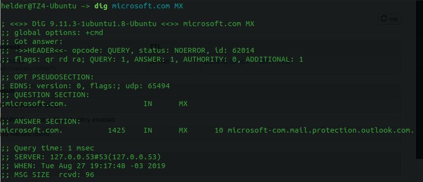 我们尝试“挖掘”域 microsoft.com 的 MX 记录,因为我们想知道它的托管位置。我们看到它的回复是: