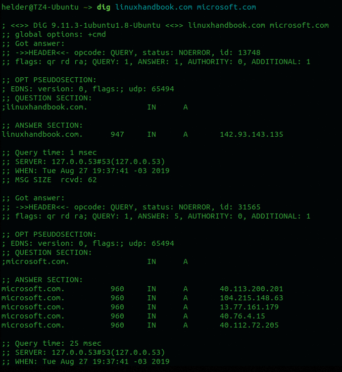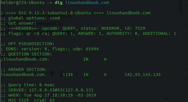 第一行输出程序的版本 (9.11.3) 并指示从何处启动查询。在本例中,它是从我的 ubuntu 计算机到 linux教程 服务器。