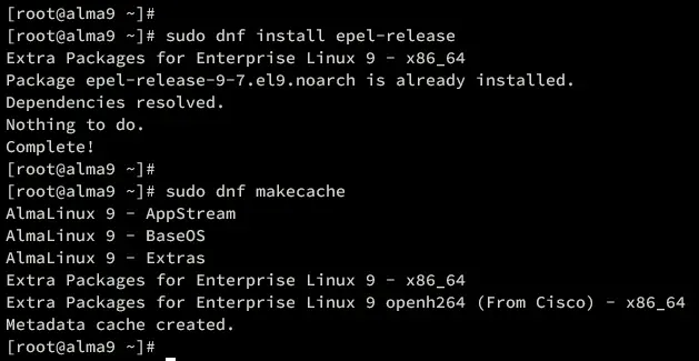 最后,使用以下命令刷新AlmaLinux上的可用存储库。