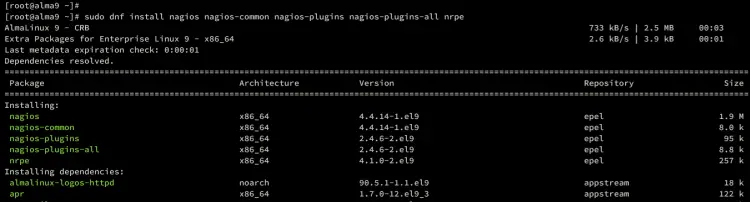 执行下面的dnf命令将Nagios、Nagios插件和Nagios NRPE插件安装到您的AlmaLinux。输入 y 继续安装。
