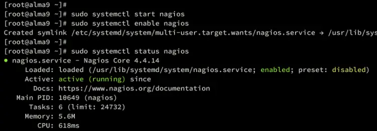 安装完成后,使用以下命令启动并启用 Nagios 服务。