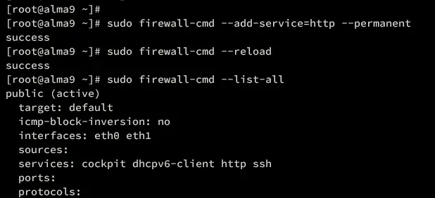 最后,执行以下命令来验证firewalld中启用列表的规则。确保您在防火墙规则中启用了 http 服务。