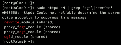 接下来,执行以下命令以确保 httpd 上的 cgi 和 rewrite 模块已启用。