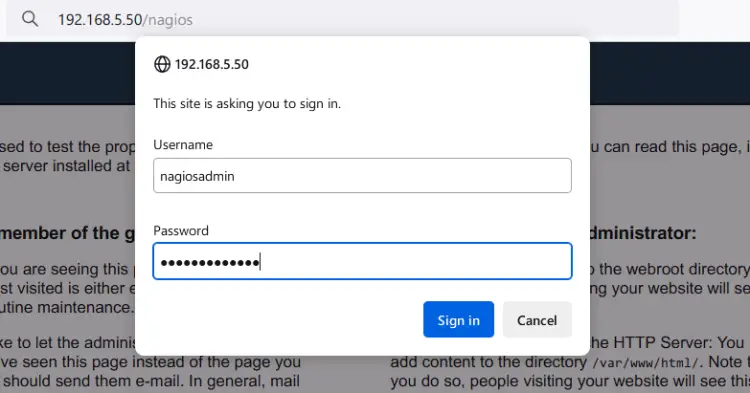 在本地计算机上,打开 Web 浏览器并访问服务器 IP 地址,后跟 /nagios 路径 (http://192.168.5.50/nagios)。当提示进行身份验证时,输入默认用户 Nagios admin 并输入您的密码,然后单击登录进行确认。
